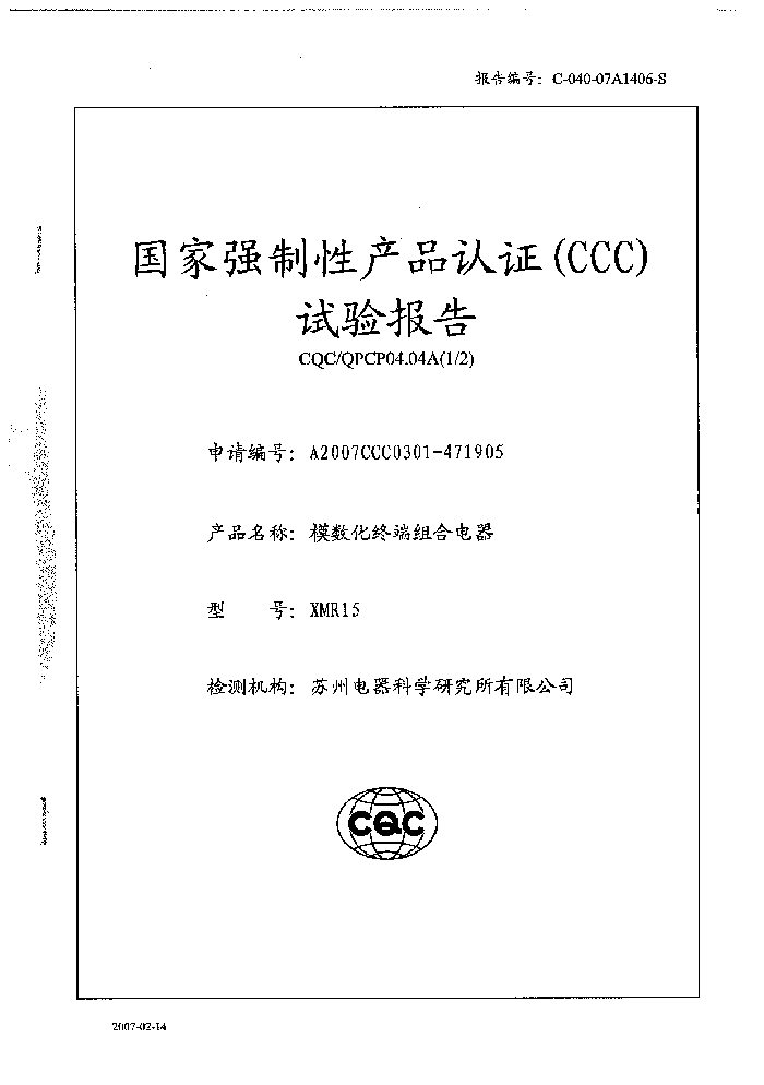 (成套)XMR15 模數(shù)化終端組合電器資質(zhì)證書