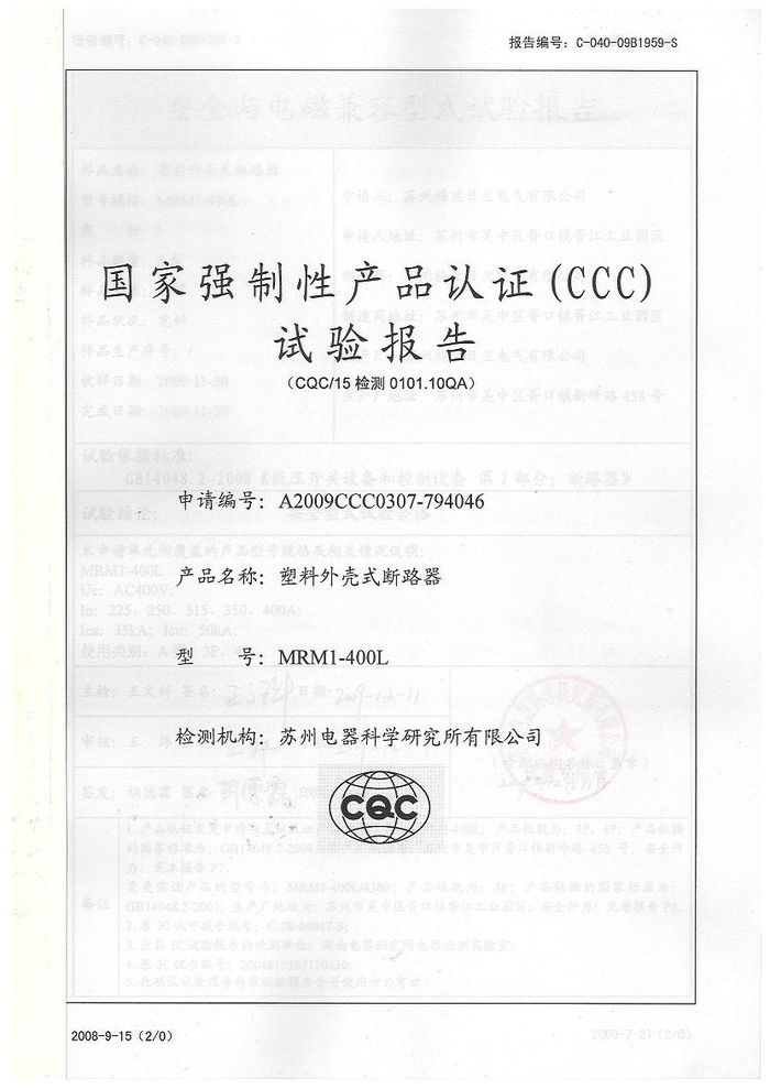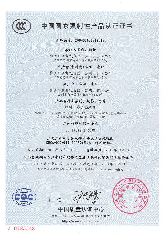MRM1-400L塑殼斷路器資質(zhì)證書